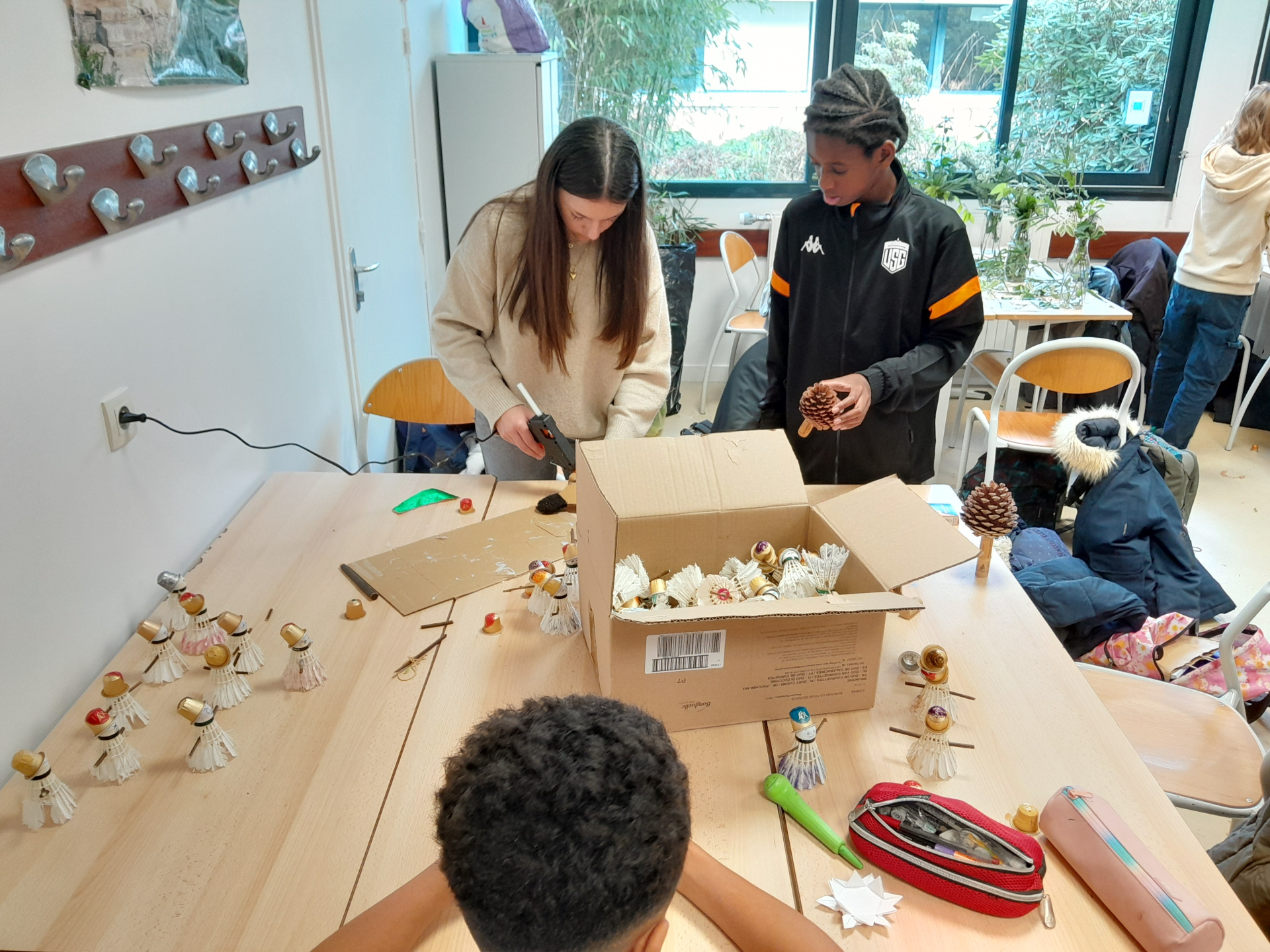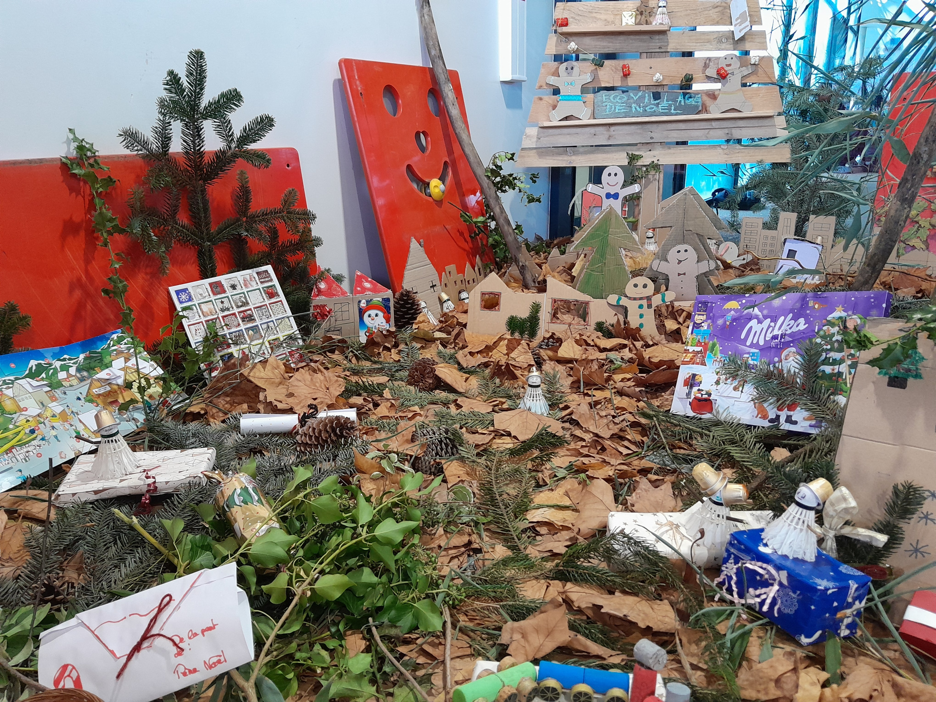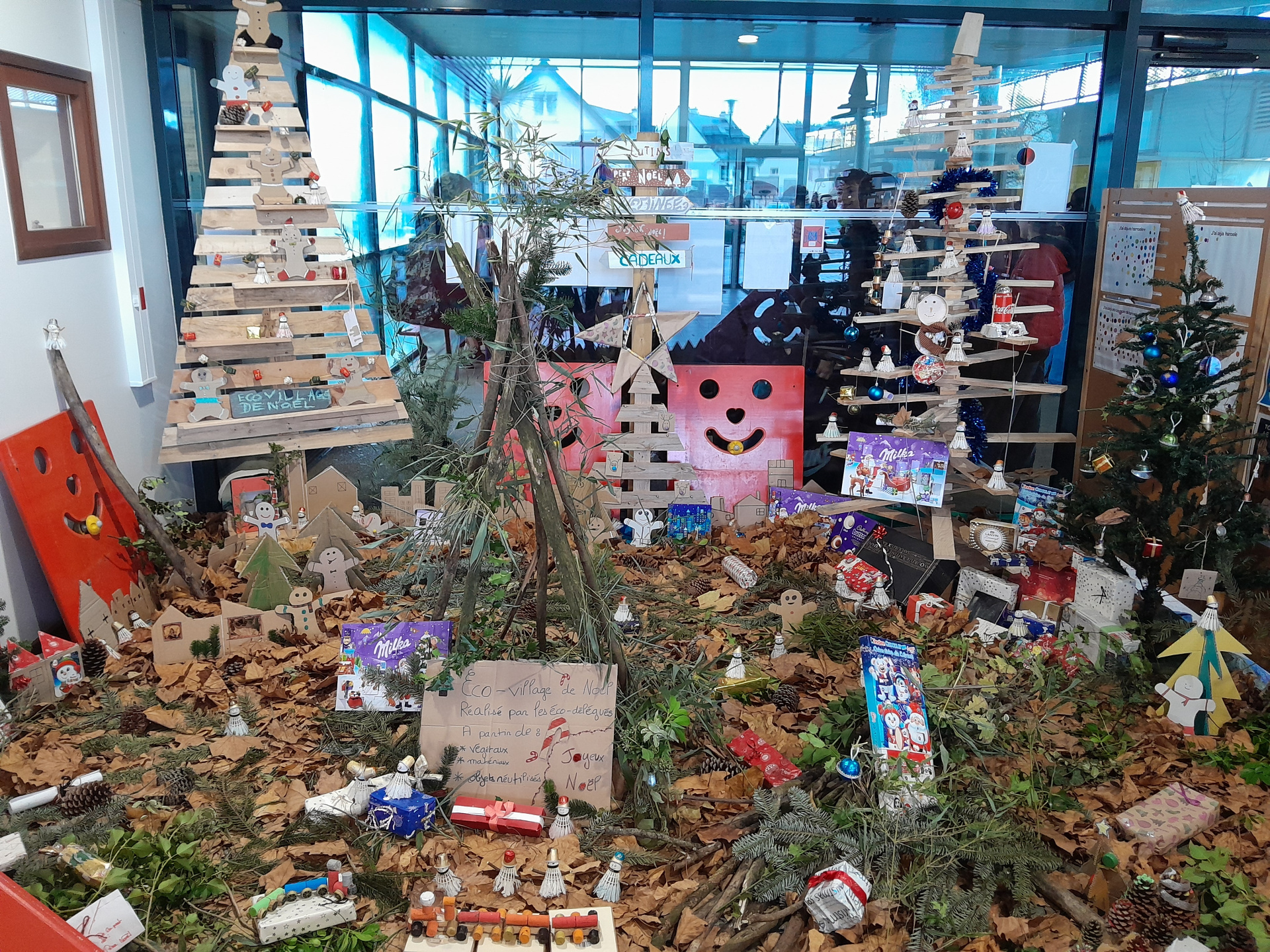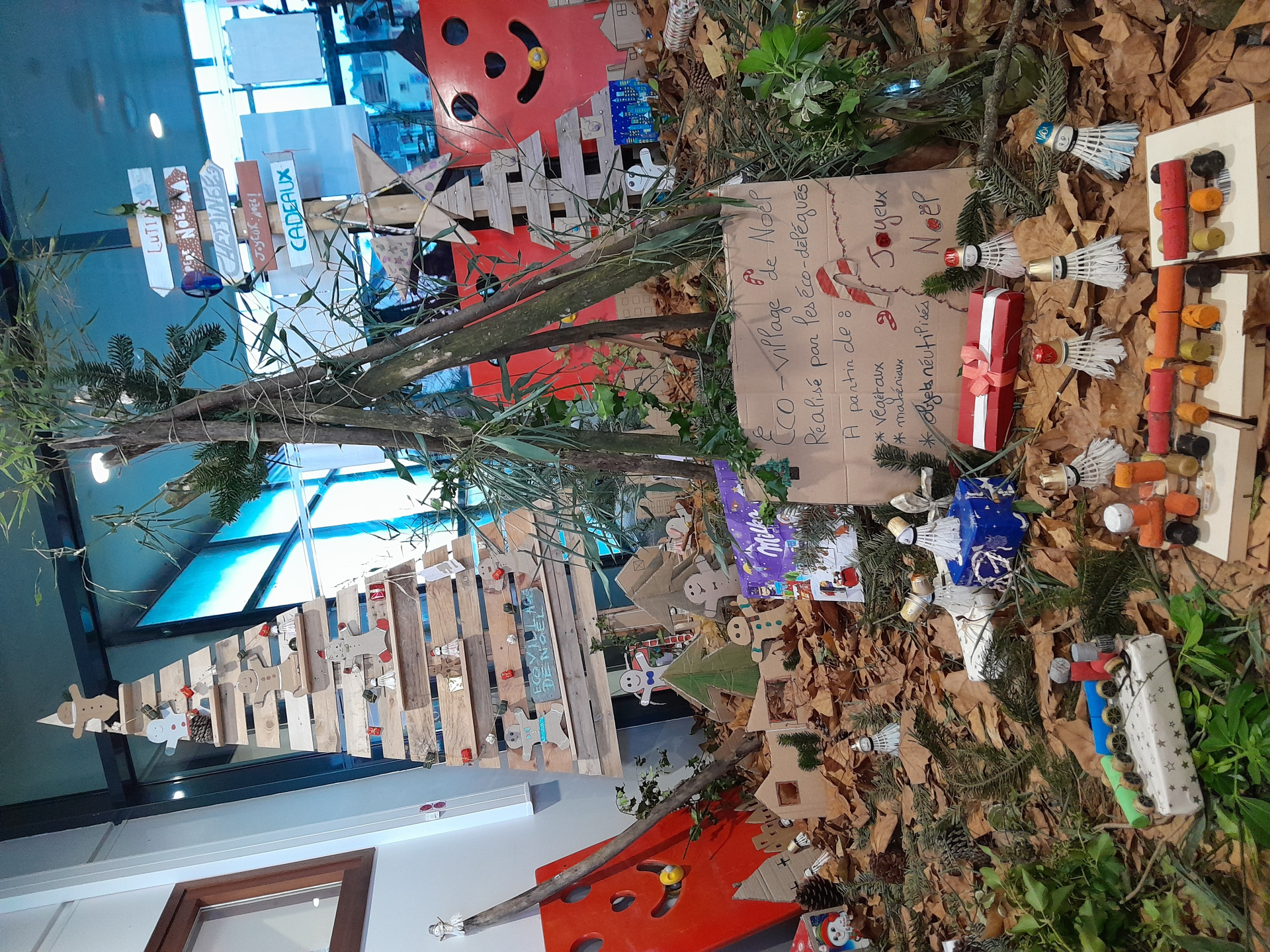 Le concept est très simple : décorer et animer le hall du collège sans dépenser, ni argent ni électricité, uniquement à partir d’objets réutilisés, de matériaux recyclés ou encore de ressources offertes par la nature :-)